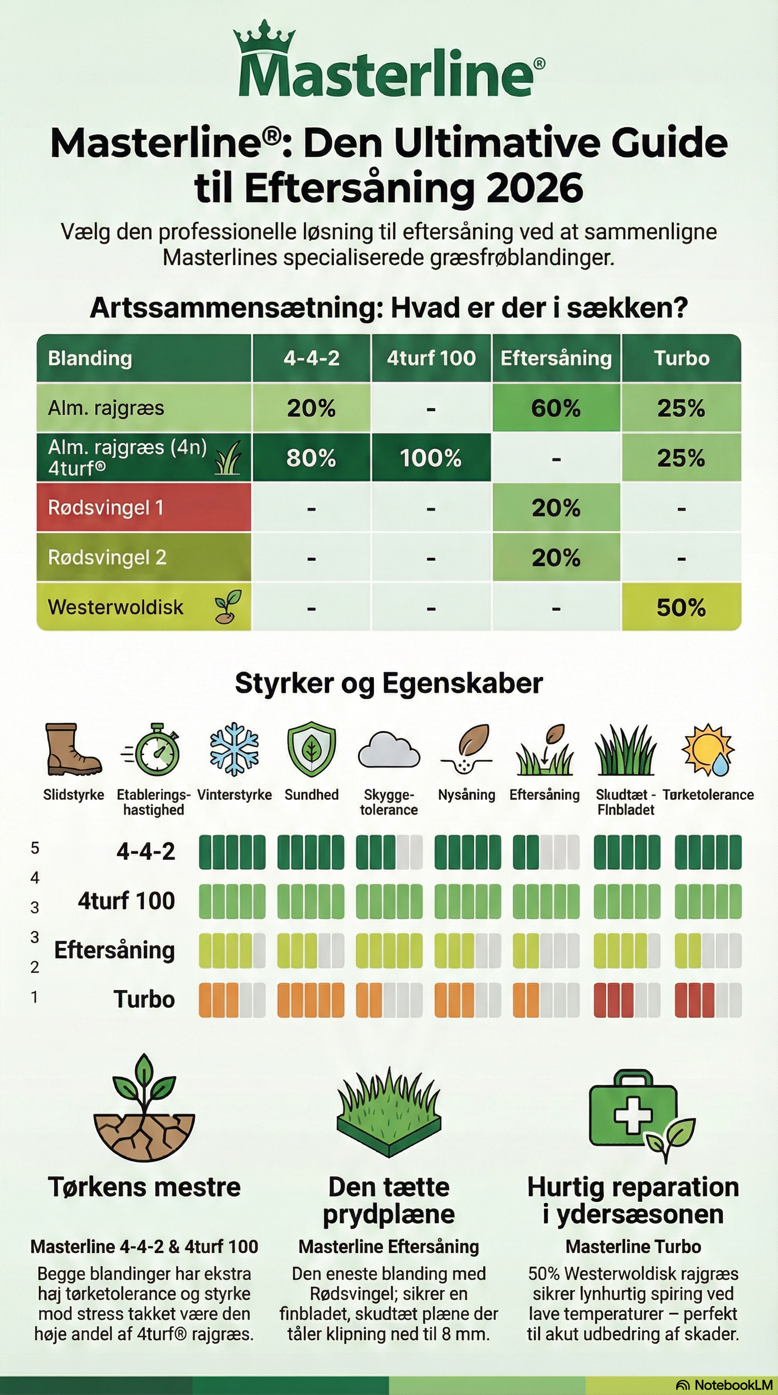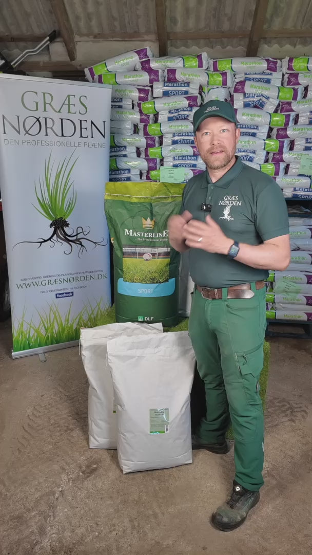 Videoen viser flere professionelle eftersåningsblandinger til boldbaner og golfbaner, bl.a. Masterline Eftersåning, 4Turf 100, 4-4-2 og Turbo, så du kan vælge efter behov for etablering og robusthed.
