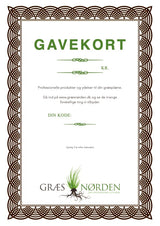 Med et gavekort kan der fx købes gødning fra 345,00 kroner, græsfrø fra 595,00 kroner eller en årlig vedligeholdelse af en græsplæne på 150 m2 for 1.495,00 kroner.